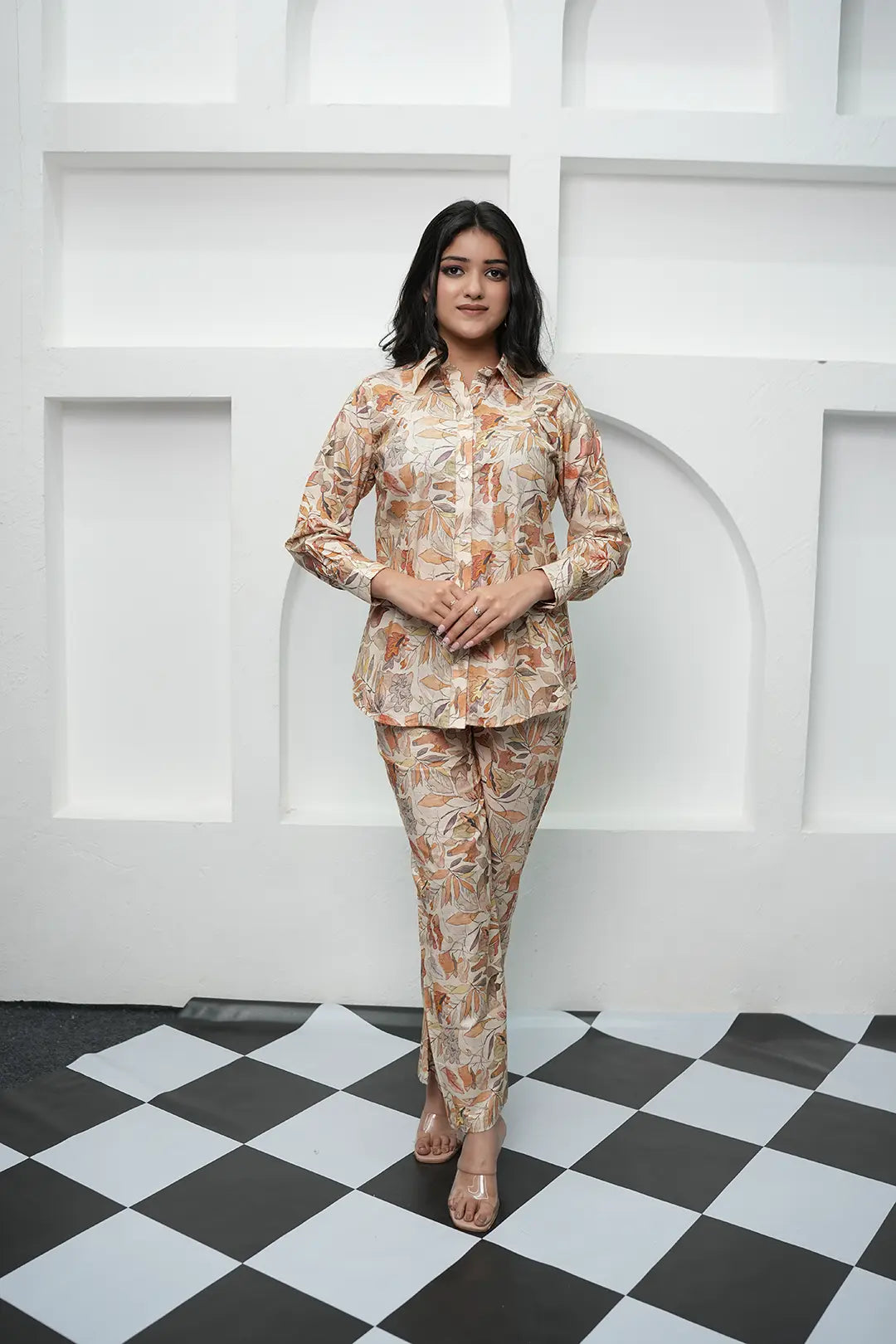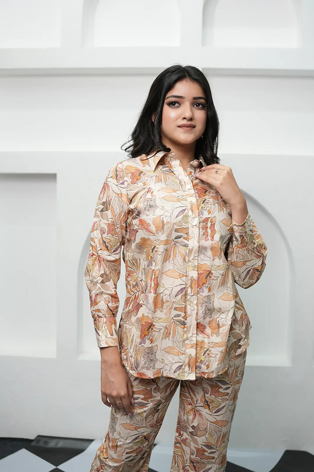 Slip into the warmth of autumn with this earthy co-ord set, painted in rust, beige, and muted brown tones. The shirt-style top with a structured collar and full sleeves is tailored in soft cotton that feels as relaxed as it looks. The delicate leafy print brings a grounded calmness, making it your go-to for slow mornings, cozy cafes, or effortless day dressing.